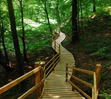 Cesta stínu Po visuté lávce i dřevěných chodníčcích napříč lesním údolím.