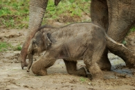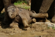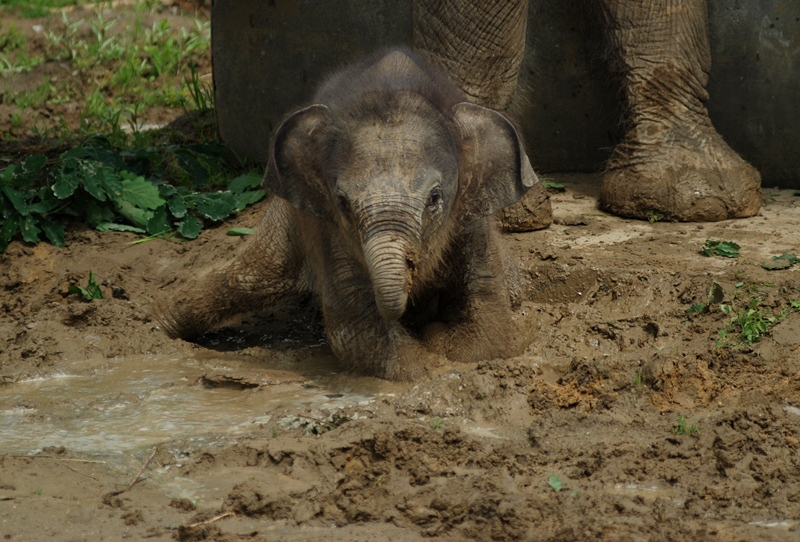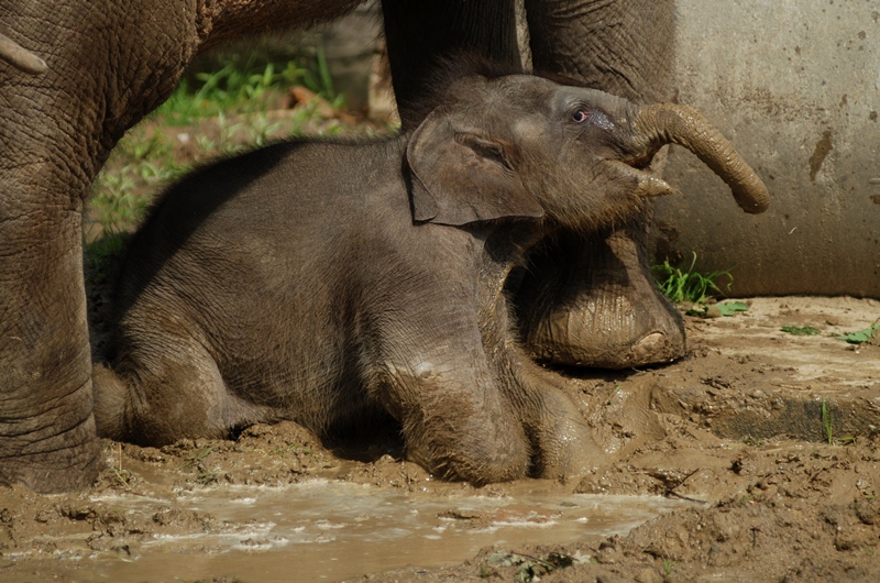 Sloní samička si dopolední pobyt ve venkovním výběhu opravdu užívá. Dovádí, běhá kolem mámy, zlepšuje svou techniku uchopování větviček, sena nebo zeleniny a prozkoumává okolí. Mezi její oblíbené aktivity patří nově i bahenní koupel v blátě, které se ve výběhu udělalo po vydatných deštích. Bahenní koupel je pro slony důležitá kosmetická procedura, která chrání jejich kůži před ostrým sluníčkem, nepříjemným hmyzem a dalšími kožními parazity. V neposlední řadě je pro ně koupel v bahně i velká zábava…