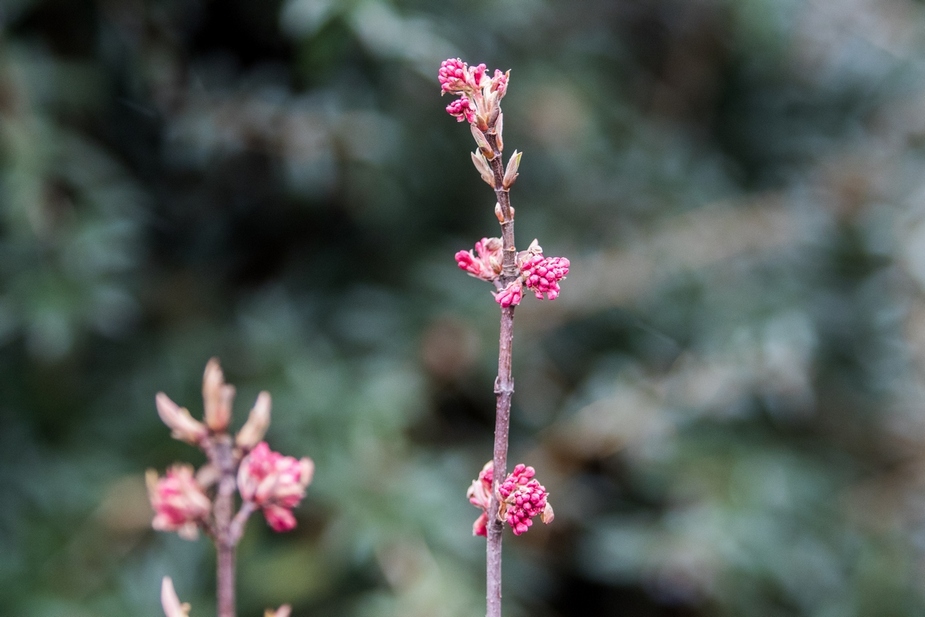 A přece! U vstupu na botanickou Cestu vody je těsně před rozkvětem kultivar kaliny bodnantské (Viburnum x bodnantense 'Dawn'). Je to kříženec východoasijské kaliny vonné a kaliny velkokvěté. Tato rostlina rozkvétá za mírných zim již ke konci prosince a vydrží kvést do března. Její květy jsou úzce trubkovité, sytě růžové barvy jako mladé a před odkvětem slabě narůžovělé. Vykvétají ve shlucích na holém dřevě. Vyznačují se pronikavou, ale velmi příjemnou sladkou vůní. Tento opadavý keř vzdušného habitu roste poměrně rychle, na pevných větvích vyrůstají nápadné vejčitě eliptické listy. Raší bronzově zbarvené a tato barvy jim vydrží až do prvních horkých dnů jara. Na podzim se listy barví do vínové.
