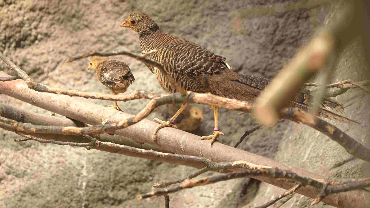 Bažant zlatý obývá voliéru společně s hejnem papoušků alexandrů čínských. V současné době zde oba druhy odchovávají mláďata. Zatímco odchov alexandrů probíhá skrytě v hnízdních budkách, bažantí mláďata vodí samice před zraky návštěvníků od vylíhnutí.