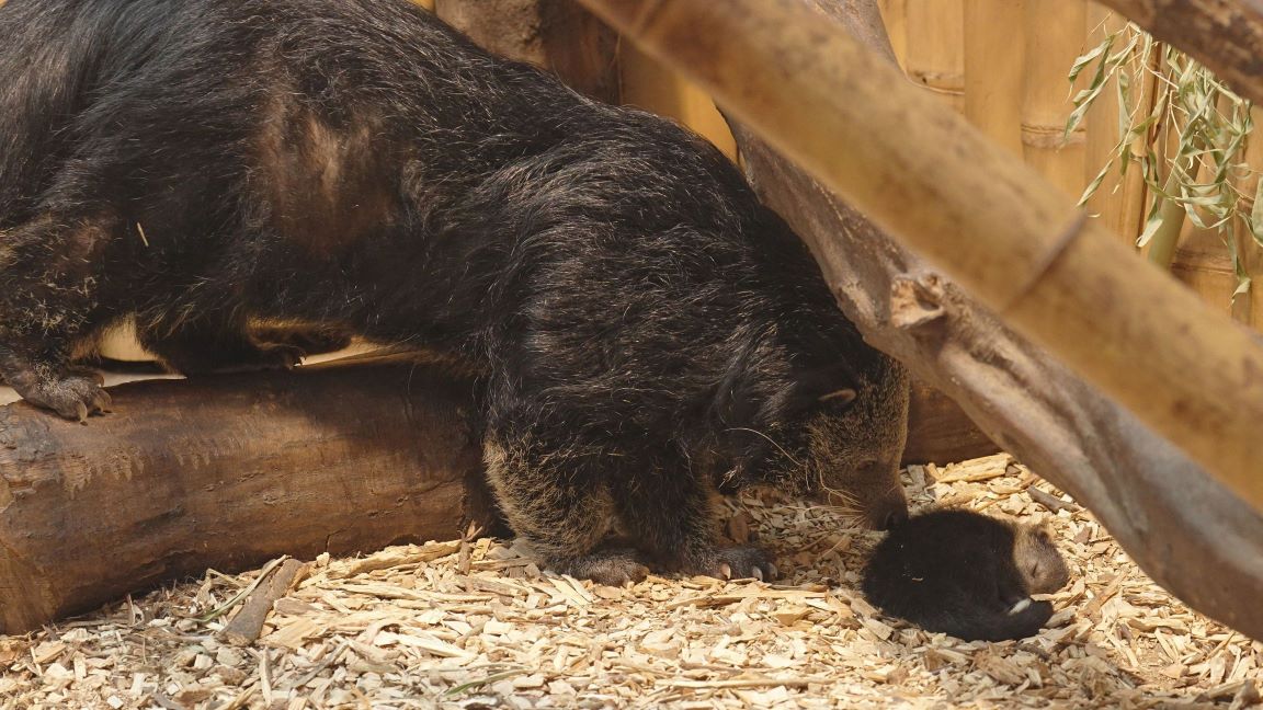 Samice binturonga v Zoologické zahradě a botanickém parku Ostrava obvykle rodí svá mláďata v době, kdy už jsou jedinci z předchozího vrhu odděleni a případně převezeni do jiných zoologických zahrad. Tentokrát však porodila výrazně dříve, takže v expozici je přítomen i její starší potomek – sameček narozený loni v květnu. Poslední mládě porodila 18. února. Soužití v rodině ale funguje dobře, takže návštěvníci mohou vidět v expozici celkem čtyři binturongy – kromě mláďat i oba jejich rodiče. Vzhledem k teplému počasí často vycházejí i do venkovního výběhu.