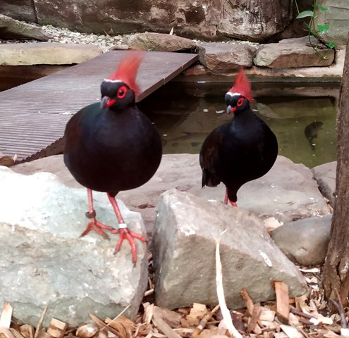 Ciało samca zdobi czarne pierze z metalicznym, zielono-niebieskim połyskiem, a głowę biały „berecik” z zawadiackim czerwonym czubem. Ciało samicy porasta zielone połyskujące pierze, jej skrzydła są kasztanowe, a na szarobrązowej głowie brak czuba. Obie płci posiadają czerwone nogi. W dzień żerują w podszyciu. Lubią nasiona, owoce, zielone części roślin i drobne bezkręgowce. Słabo latają, jednak noc spędzają grzędując na drzewach. Samica znosi 4- 8 białych jajek do gniazda – dołku w ziemi wyściełanego trawą i liśćmi. Młode wykluwają się po 17 - 20 dniach i same poszukują pokarmu.